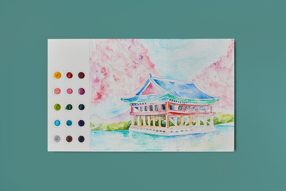 라인 안을 물감으로 자유롭게 채웁니다. 밝은 색상부터 칠하면 좋습니다. 샘플 트레이싱지를 참고하여 따라 칠하거나, 나만의 감성대로 색을 채워나가면 됩니다.