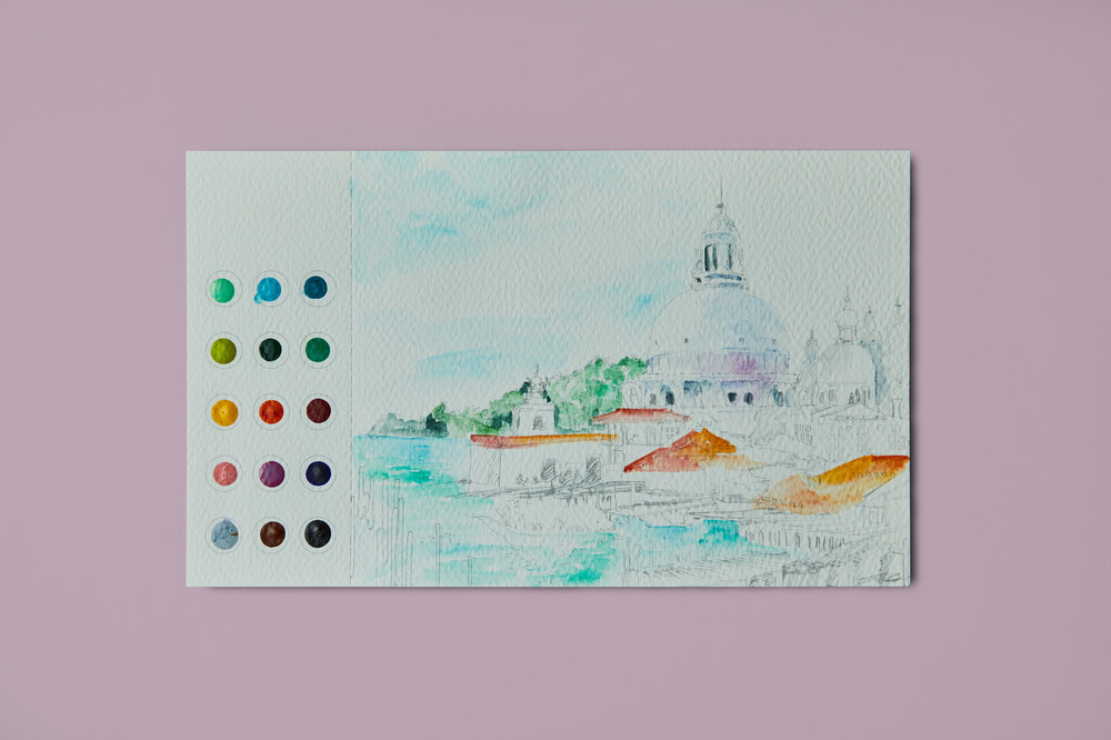 튜토리얼을 따라 수채화의 기본 표현을 연습해봅니다. 물을 많이 쓰면 연하게, 적게 사용하면 진하게 발색됩니다. 마르지 않은 물감 위에 다른 색을 덧대어 표현하면 색 혼합 효과를 낼 수 있습니다.